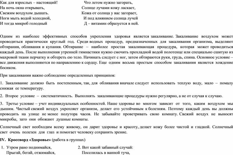 IV. Кроссворд «Здоровье» (работа в группах)