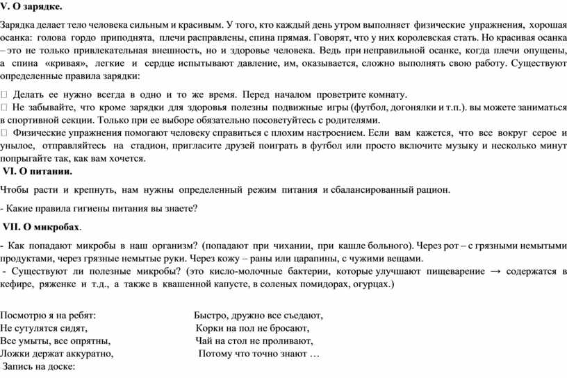 Зарядка делает тело человека сильным и красивым. У того, кто каждый день утром выполняет физические упражнения, хорошая осанка: голова гордо приподнята, плечи расправлены, спина прямая. Говорят, что у них королевская стать. Но красивая осанка – это не только привлекательная внешность, но и здоровье человека. Ведь при неправильной осанке, когда плечи опущены, а спина «кривая», легкие и сердце испытывают давление, им, оказывается, сложно выполнять свою работу. Существуют определенные правила зарядки: