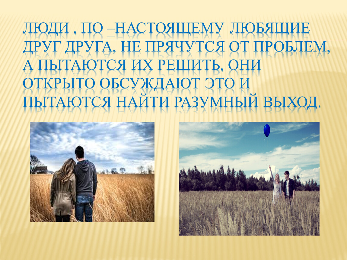 Люди , по –настоящему любящие друг друга, не прячутся от проблем, а пытаются их решить, Они открыто обсуждают это и пытаются найти разумный выход.