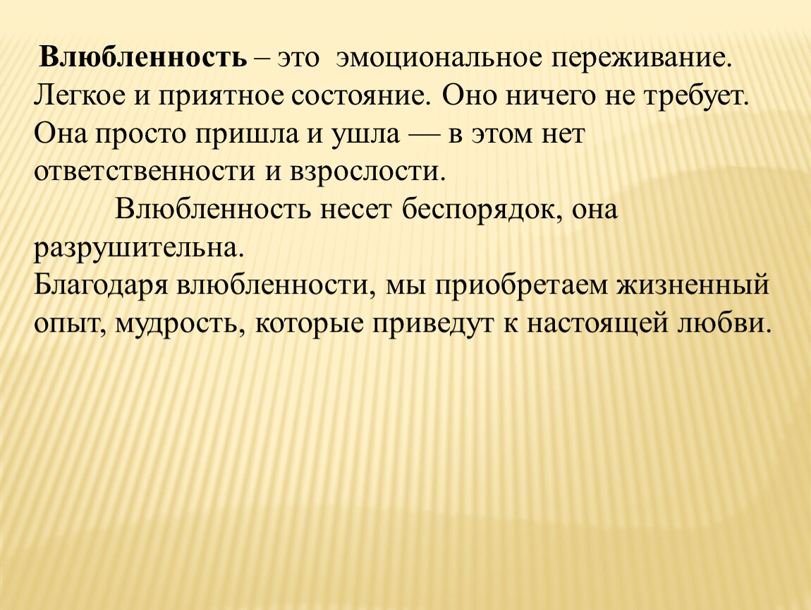 Влюбленность – это эмоциональное переживание. Легкое и приятное состояние. Оно ничего не требует. Она просто пришла и ушла — в этом нет ответственности и взрослости.