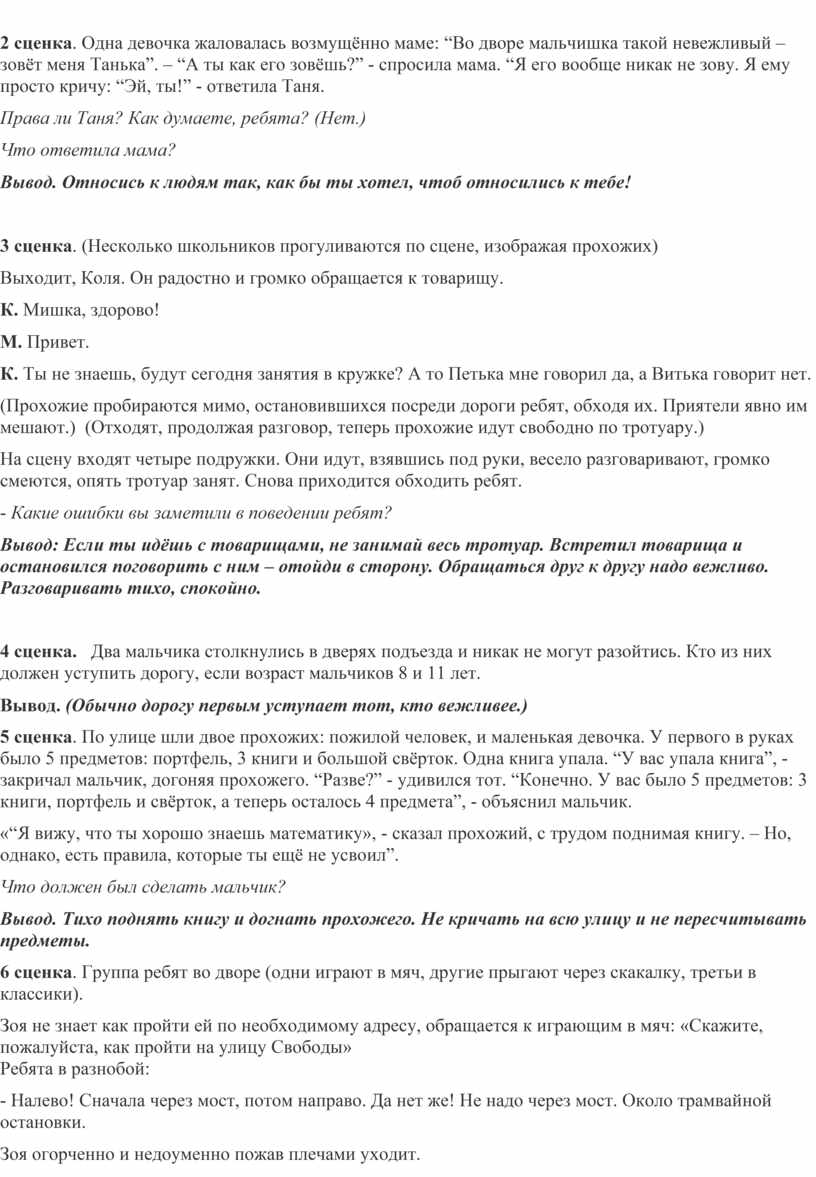 Вывод: Если ты идёшь с товарищами, не занимай весь тротуар. Встретил товарища и остановился поговорить с ним – отойди в сторону. Обращаться друг к другу надо вежливо. Разговаривать тихо, спокойно.