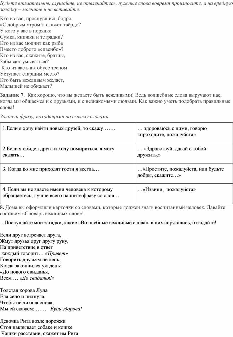 Задание 7. Как хорошо, что вы желаете быть вежливыми! Ведь волшебные слова выручают нас, когда мы общаемся и с друзьями, и с незнакомыми людьми. Как важно уметь подобрать правильные слова!