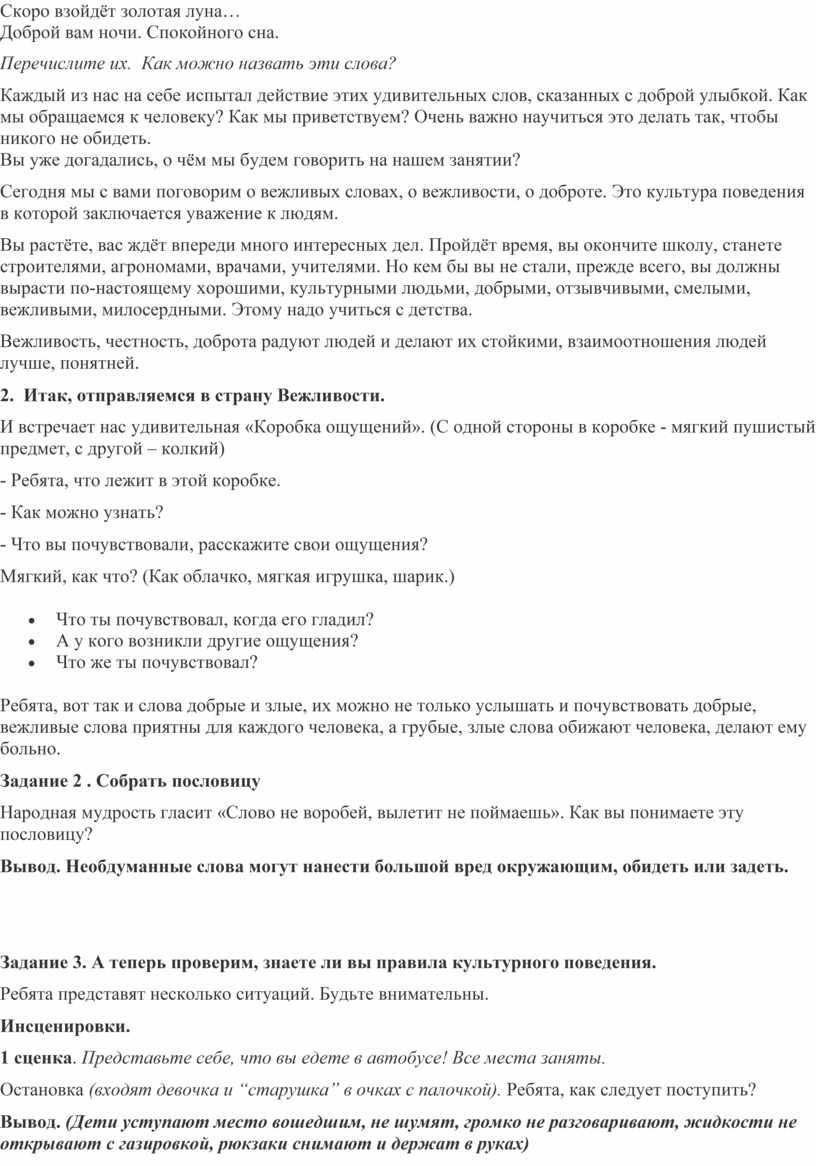 Цель занятия: привитие детям потребности культурного поведения.