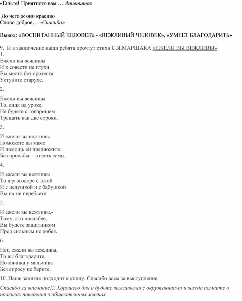 9. И в заключение наши ребята прочтут стихи С.Я.МАРШАКА «ЕЖЕЛИ ВЫ ВЕЖЛИВЫ»