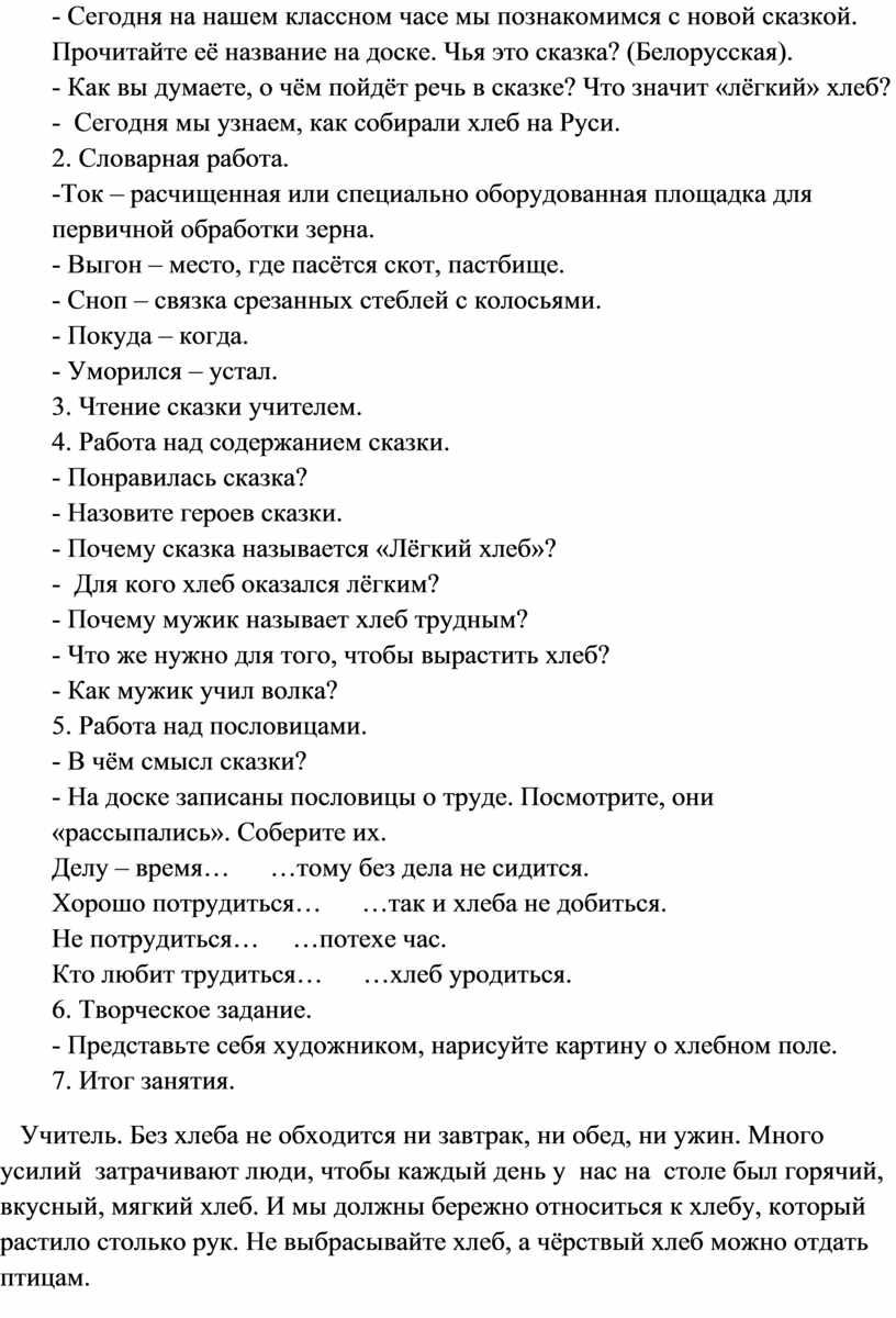 Учитель. Без хлеба не обходится ни завтрак, ни обед, ни ужин. Много усилий затрачивают люди, чтобы каждый день у нас на столе был горячий, вкусный, мягкий хлеб. И мы должны бережно относиться к хлебу, который растило столько рук. Не выбрасывайте хлеб, а чёрствый хлеб можно отдать птицам.