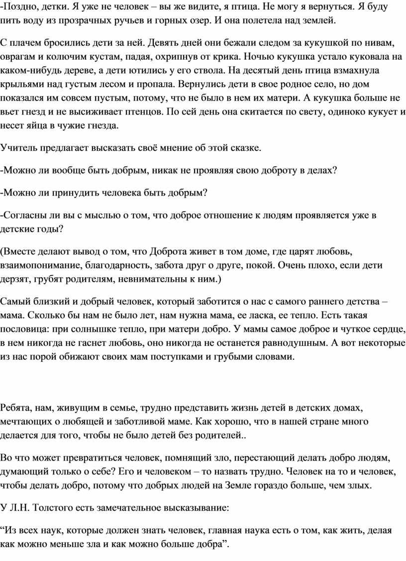 (Вместе делают вывод о том, что Доброта живет в том доме, где царят любовь, взаимопонимание, благодарность, забота друг о друге, покой. Очень плохо, если дети дерзят, грубят родителям, невнимательны к ним.)