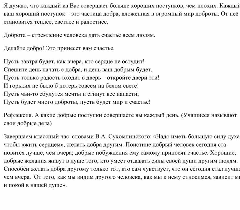 остудит! Рефлексия. А какие добрые поступки совершаете вы каждый день. (Учащиеся называют свои добрые дела) Завершаем классный час словами В.А. Сухомлинского: «Надо иметь большую силу духа, чтобы «жить сердцем», желать добра другим. Поистине добрый человек сегодня становится лучше, чем вчера; добрые побуждения ему самому приносят счастье. Хорошие, добрые желания живут в душе того, кто умеет отдавать силы своей души другим людям. Способен желать добра другому только тот, кто сам чувствует, что он сегодня стал лучше, чем вчера. От того, как мы видим другого человека, как мы к нему относимся, зависит мир и покой в нашей душе». |