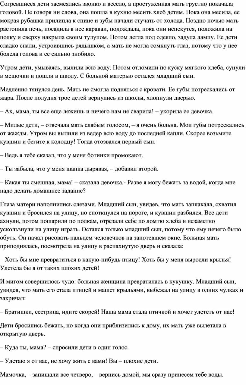 – Милые дети, – отвечала мать слабым голосом, – я очень больна. Мои губы потрескались от жажды. Утром вы вылили из ведер всю воду до последней капли. Скорее возьмите кувшин и бегите к колодцу! Тогда отозвался первый сын: