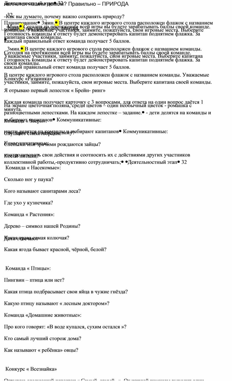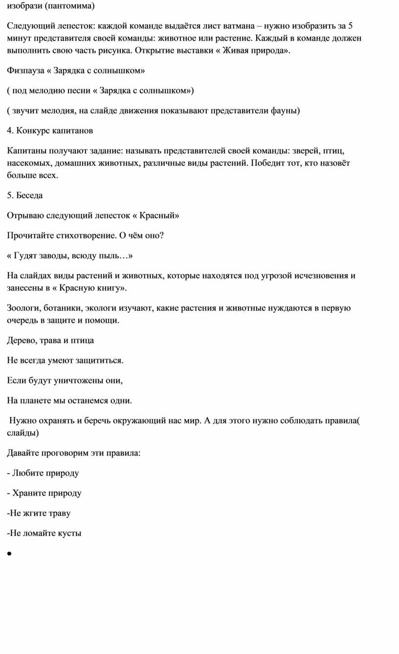 Отрываю следующий лепесток « Самый, самый...». От каждой команды выходит один представитель. На слайдах открываются вопросы, кто первым из представителей команды назовёт ответ, тот получает 1 балл. Родилась в воде, а живёт на земле? Кто спит вниз головой? Что делает ёж зимой? Какой лесной зверь любит малину? Кто бежит, выставляя вперёд задние лапы? Какое растение всегда дрожит? Зачем зайцу большие уши? Умываются ли насекомые? Какая самая маленькая птица? Самое быстрое животное суши? Кит – рыба или зверь? Растёт ли дерево зимой? Какая нить в природе самая тонкая? Самое быстрое морское животное? 3. Задание « Нарисуй и изобрази (пантомима) Следующий лепесток: каждой команде выдаётся лист ватмана – нужно изобразить за 5 минут представителя своей команды: животное или растение. Каждый в команде должен выполнить свою часть рисунка. Открытие выставки « Живая природа». Физпауза « Зарядка с солнышком» ( под мелодию песни « Зарядка с солнышком») ( звучит мелодия, на слайде движения показывают представители фауны) 4. Конкурс капитанов Капитаны получают задание: называть представителей своей команды: зверей, птиц, насекомых, домашних животных, различные виды растений. Победит тот, кто назовёт больше всех. 5. Беседа Отрываю следующий лепесток « Красный» Прочитайте стихотворение. О чём оно? « Гудят заводы, всюду пыль…» На слайдах виды растений и животных, которые находятся под угрозой исчезновения и занесены в « Красную книгу». Зоологи, ботаники, экологи изучают, какие растения и животные нуждаются в первую очередь в защите и помощи. Дерево, трава и птица Не всегда умеют защититься. Если будут уничтожены они, На планете мы останемся одни. Нужно охранять и беречь окружающий нас мир. А для этого нужно соблюдать правила( слайды) Давайте проговорим эти правила: - Любите природу - Храните природу -Не жгите траву -Не ломайте кусты