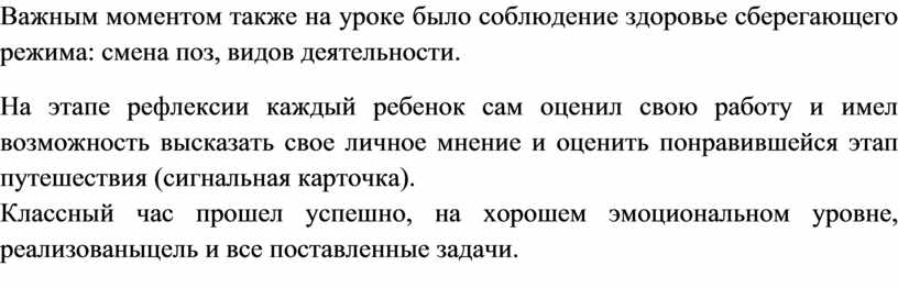Старалась создать ситуацию психологического комфорта для детей, когда каждый ребенок успешен в своем мнении и не боится высказаться. Учебное время на уроке использовалось эффективно, запланированный объём урока выполнен. Интенсивность урока была оптимальной с учётом физических и психологических особенностей данного класса Этапы урока были тесно взаимосвязаны между собой, чередовались различные виды деятельности. Умственные действия опирались и подкреплялись практическими. Учебный материал на протяжении всего урока работал на организацию посильного поиска и исследования второклассников, соответствовал их жизненному опыту.