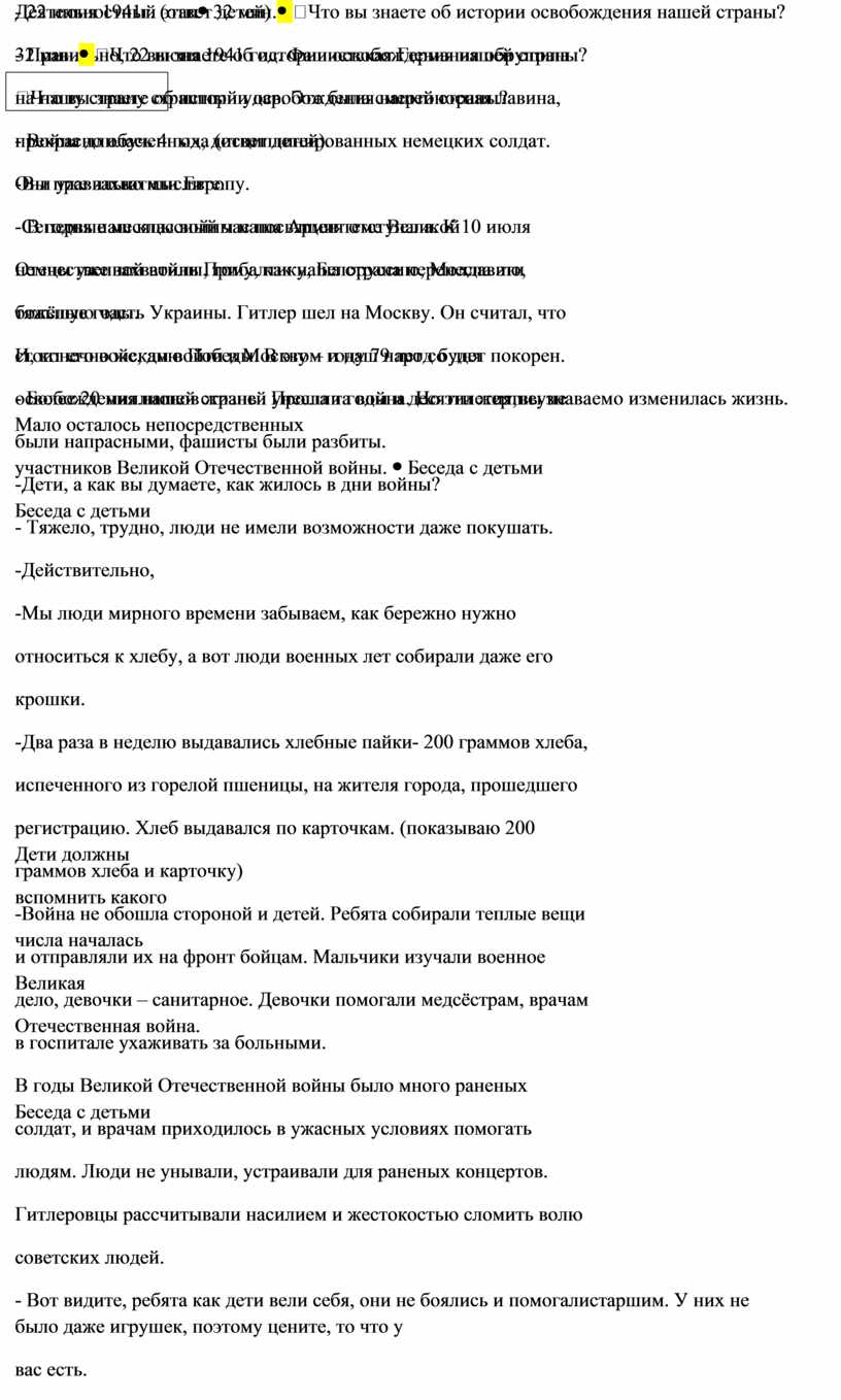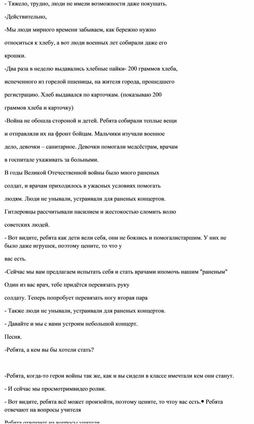 ⁃Что вы знаете об истории освобождения нашей страны? - Война длилась 4 года (ответ детей). -Вы правильно мыслите. - В первые месяцы войны наша Армия отступала. К 10 июля немцы уже захватили Прибалтику, Белоруссию, Молдавию, большую часть Украины. Гитлер шел на Москву. Он считал, что стоит его войскам войти в Москву – и наш народ будет покорен. - Более 20 миллионов жизней унесла та война. Но эти жертвы не были напрасными, фашисты были разбиты. -Дети, а как вы думаете, как жилось в дни войны? - Тяжело, трудно, люди не имели возможности даже покушать. -Действительно, -Мы люди мирного времени забываем, как бережно нужно относиться к хлебу, а вот люди военных лет собирали даже его крошки. -Два раза в неделю выдавались хлебные пайки- 200 граммов хлеба, испеченного из горелой пшеницы, на жителя города, прошедшего регистрацию. Хлеб выдавался по карточкам. (показываю 200 граммов хлеба и карточку) -Война не обошла стороной и детей. Ребята собирали теплые вещи и отправляли их на фронт бойцам. Мальчики изучали военное дело, девочки – санитарное. Девочки помогали медсёстрам, врачам в госпитале ухаживать за больными. В годы Великой Отечественной войны было много раненых солдат, и врачам приходилось в ужасных условиях помогать людям. Люди не унывали, устраивали для раненых концертов. Гитлеровцы рассчитывали насилием и жестокостью сломить волю советских людей. - Вот видите, ребята как дети вели себя, они не боялись и помогалистаршим. У них не было даже игрушек, поэтому цените, то что у вас есть. -Сейчас мы вам предлагаем испытать себя и стать врачами ипомочь нашим "раненым" Один из вас врач, тебе придётся перевязать руку солдату. Теперь попробует перевязать ногу вторая пара - Также люди не унывали, устраивали для раненых концертов. - Давайте и мы с вами устроим небольшой концерт. Песня. -Ребята, а кем вы бы хотели стать?