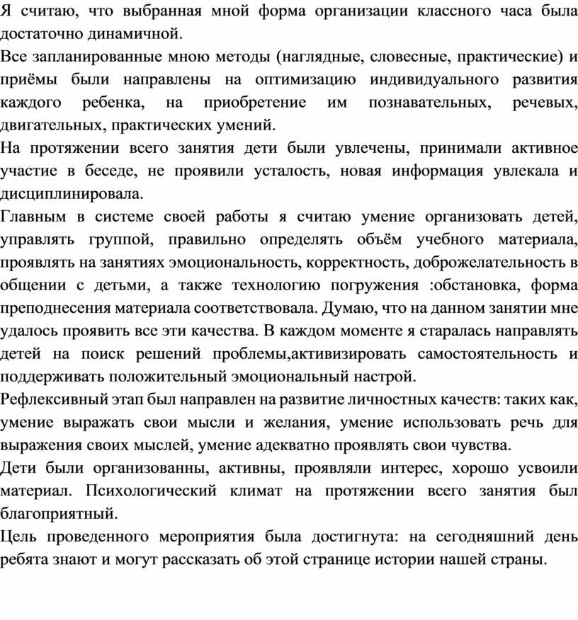 Я считаю, что выбранная мной форма организации классного часа была достаточно динамичной.
