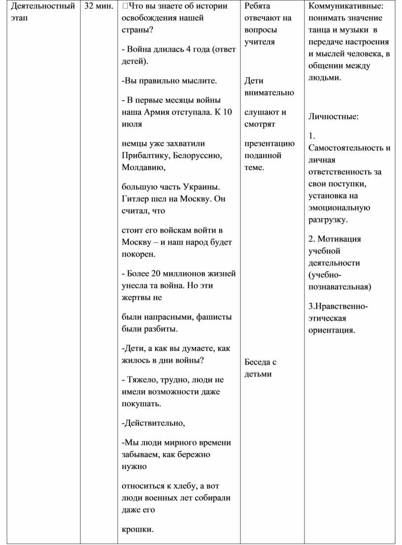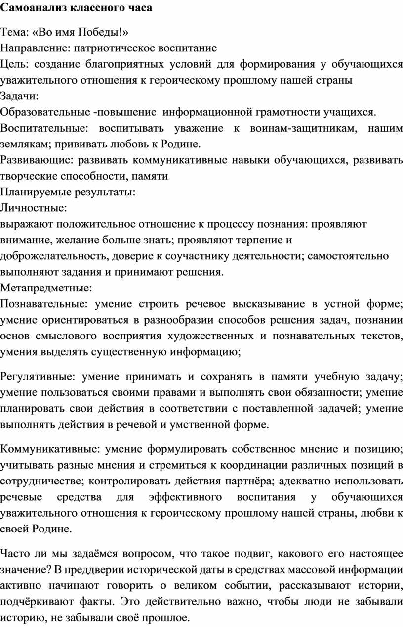 Коммуникативные: умение формулировать собственное мнение и позицию; учитывать разные мнения и стремиться к координации различных позиций в сотрудничестве; контролировать действия партнёра; адекватно использовать речевые средства для эффективного воспитания у обучающихся уважительного отношения к героическому прошлому нашей страны, любви к своей Родине.