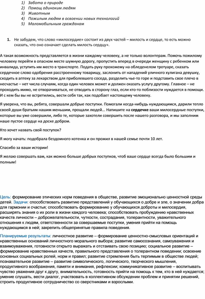 Цель: формирование этических норм поведения в обществе, развитие эмоционально ценностной среды детей. Задачи: способствовать развитию представлений у обучающихся о добре и зле, о значении добра для гармонии и счастья; способствовать формированию у обучающихся доброты и милосердия, расширять знания о их роли в жизни каждого человека; способствовать пробуждению нравственных качеств личности – доброжелательности, чуткости, сострадания, толерантности, уважительного отношения к людям, ответственности за совершаемые поступки, умения прийти на помощь нуждающимся в ней; закрепить общепринятые правила поведения.