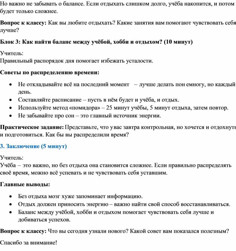 Блок 3: Как найти баланс между учёбой, хобби и отдыхом? (10 минут)