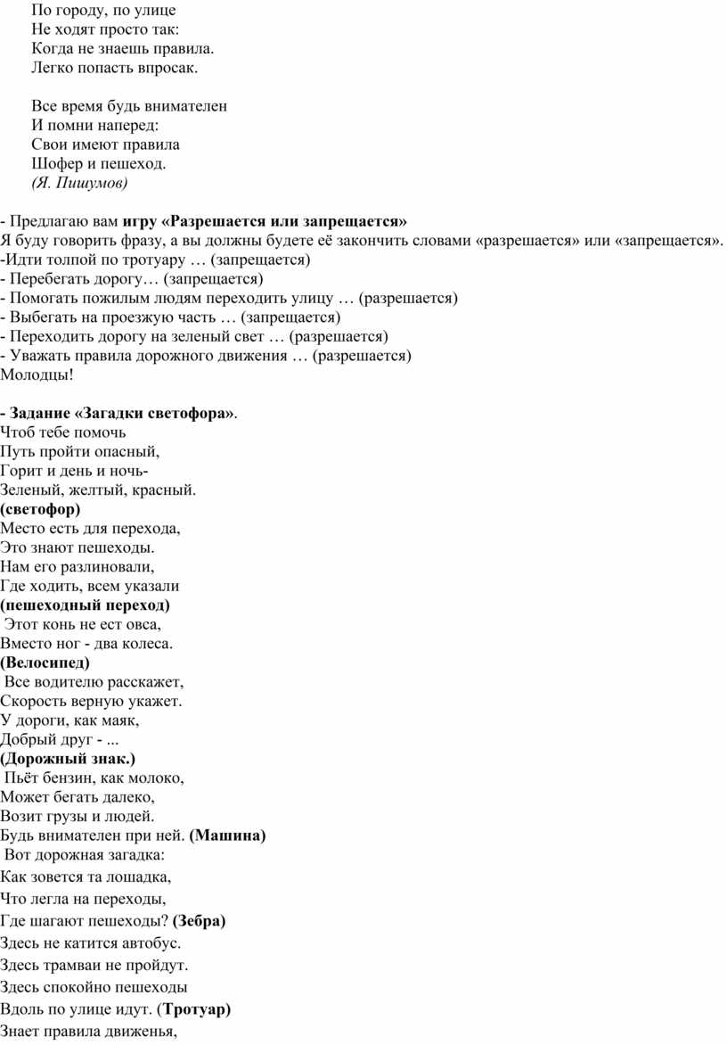 Молодцы! Я знаю, что вы приготовили загадки и стихотворения о правилах дорожного движения (дети загадывают друг другу загадки).