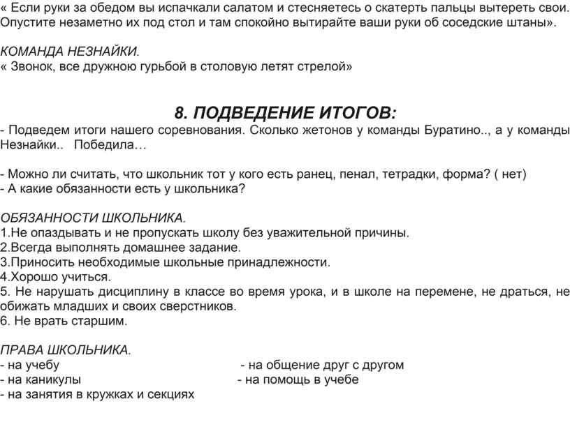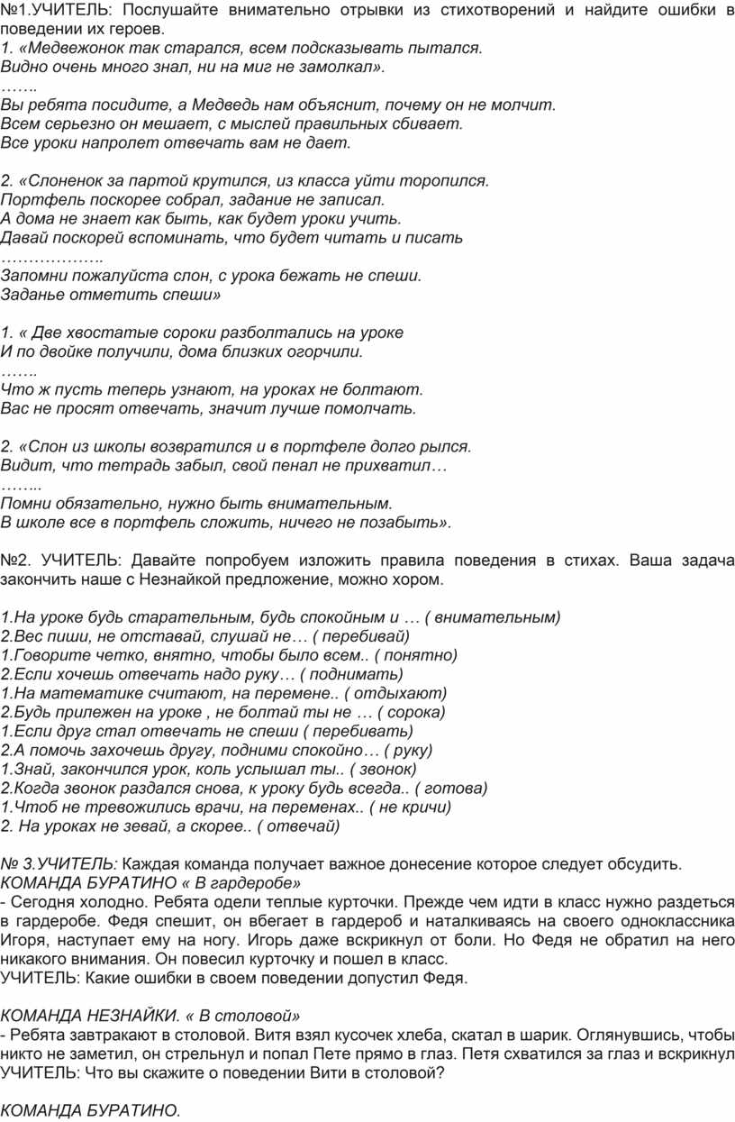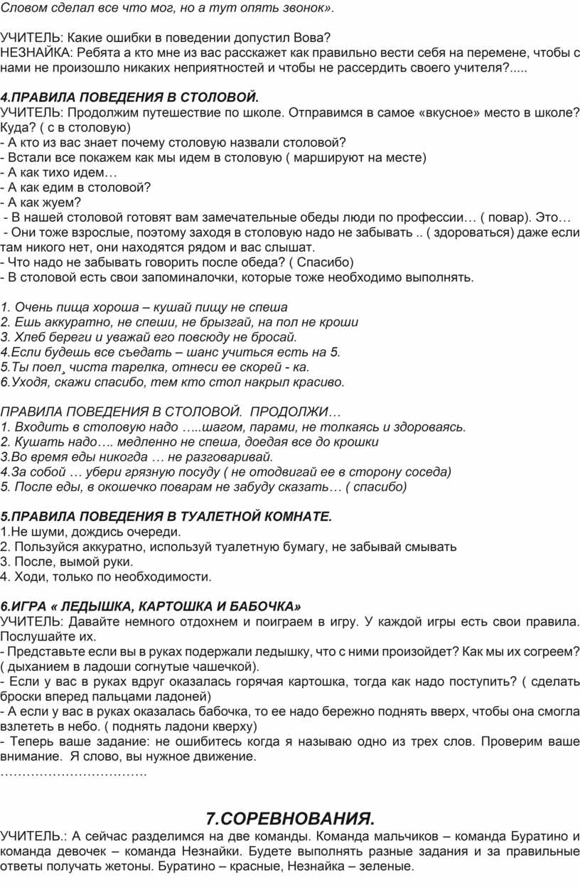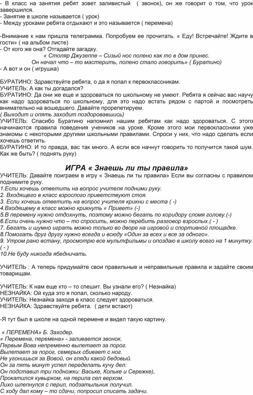 НЕЗНАЙКА: Ребята а кто мне из вас расскажет как правильно вести себя на перемене, чтобы с нами не произошло никаких неприятностей и чтобы не рассердить своего учителя?.....