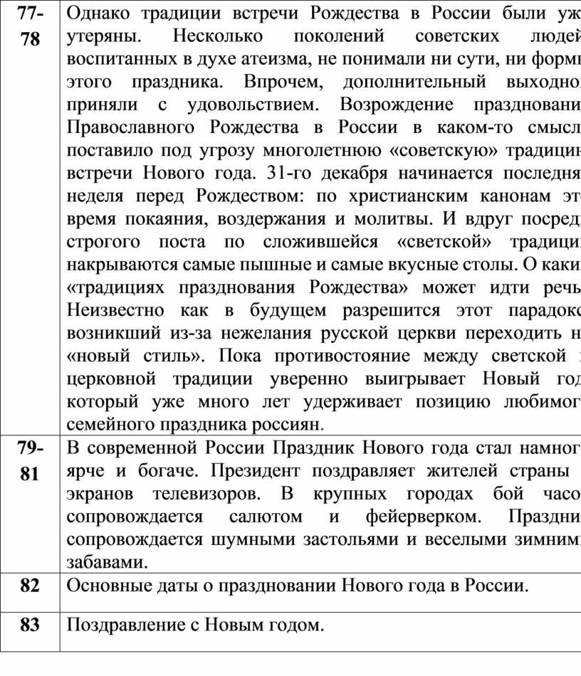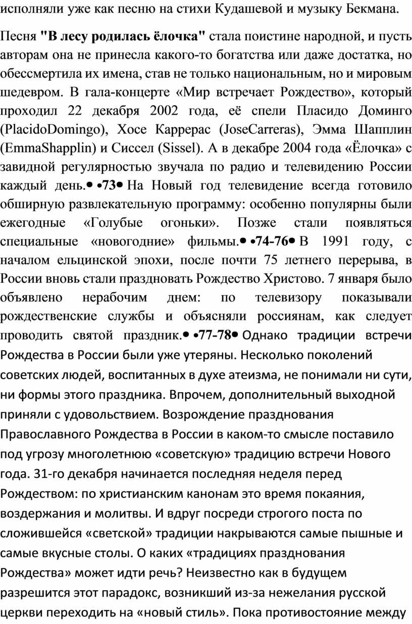 Однако традиции встречи Рождества в России были уже утеряны. Несколько поколений советских людей, воспитанных в духе атеизма, не понимали ни сути, ни формы этого праздника. Впрочем, дополнительный выходной приняли с удовольствием. Возрождение празднования Православного Рождества в России в каком-то смысле поставило под угрозу многолетнюю «советскую» традицию встречи Нового года. 31-го декабря начинается последняя неделя перед Рождеством: по христианским канонам это время покаяния, воздержания и молитвы. И вдруг посреди строгого поста по сложившейся «светской» традиции накрываются самые пышные и самые вкусные столы. О каких «традициях празднования Рождества» может идти речь? Неизвестно как в будущем разрешится этот парадокс, возникший из-за нежелания русской церкви переходить на «новый стиль». Пока противостояние между светской и церковной традиции уверенно выигрывает Новый год, который уже много лет удерживает позицию любимого семейного праздника россиян. |