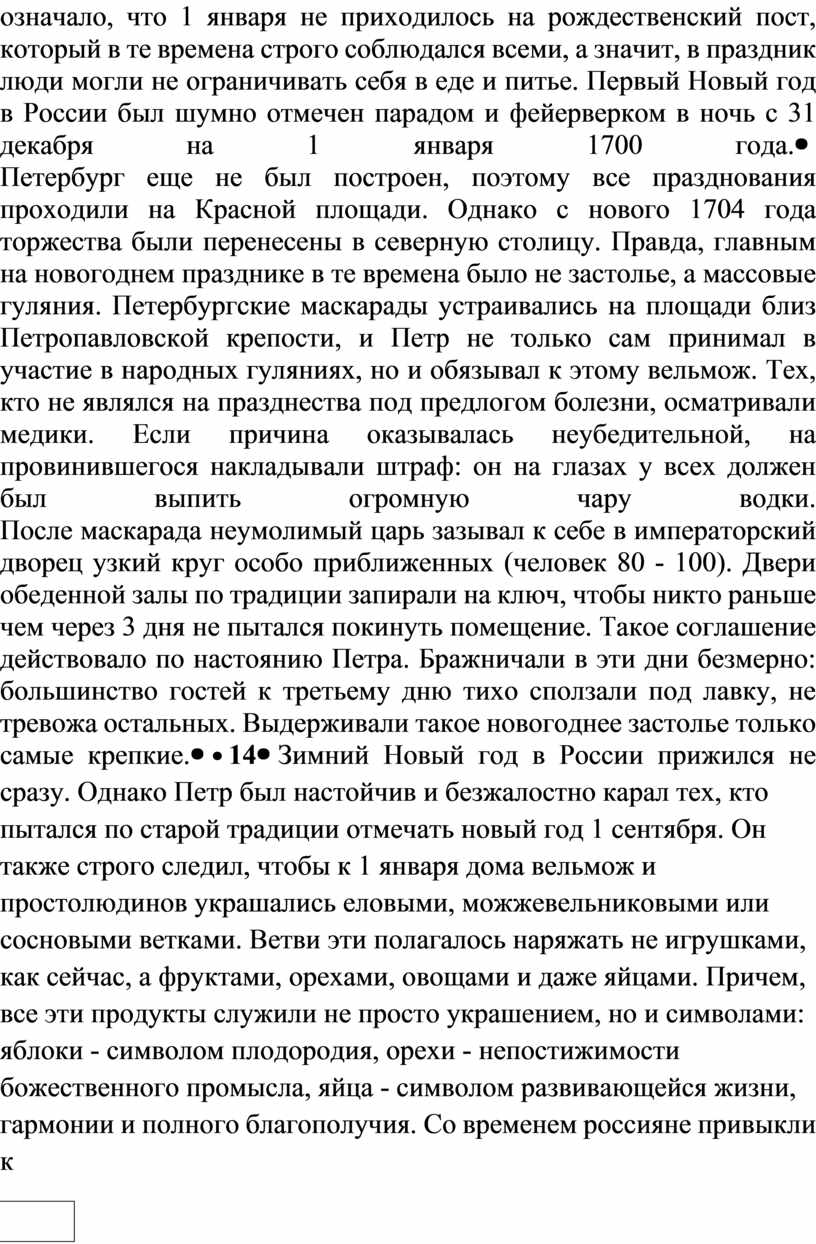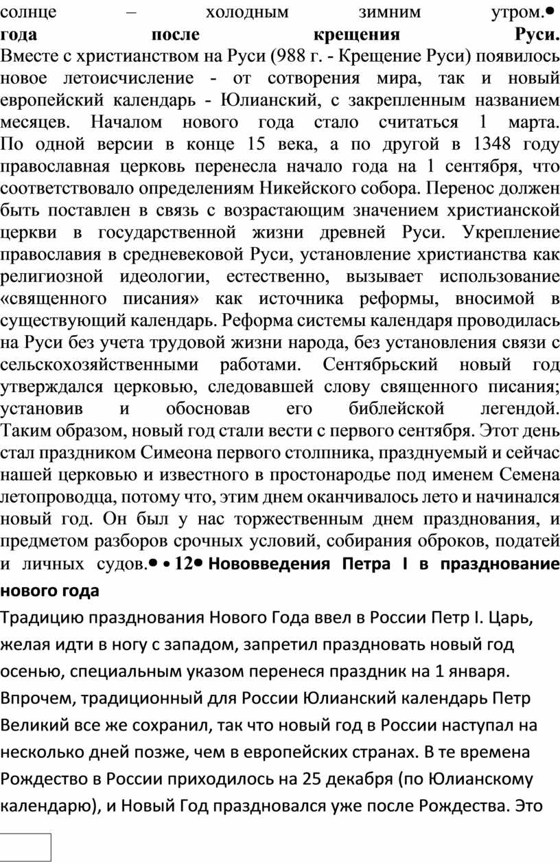 Празднование нового года на Руси имеет такую же сложную судьбу, как и сама ее история. Прежде всего, все изменения в праздновании нового года были связаны с самыми важными историческими событиями, затрагивавшими все государство и каждого человека в отдельности. Несомненно, что народная традиция даже после официально вводимых изменений в календаре еще долго сохраняла древние обычаи. |