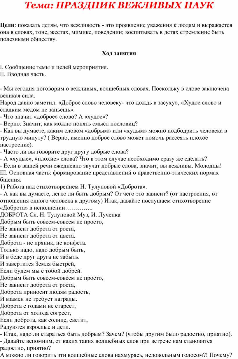 Тема: ПРАЗДНИК ВЕЖЛИВЫХ НАУК