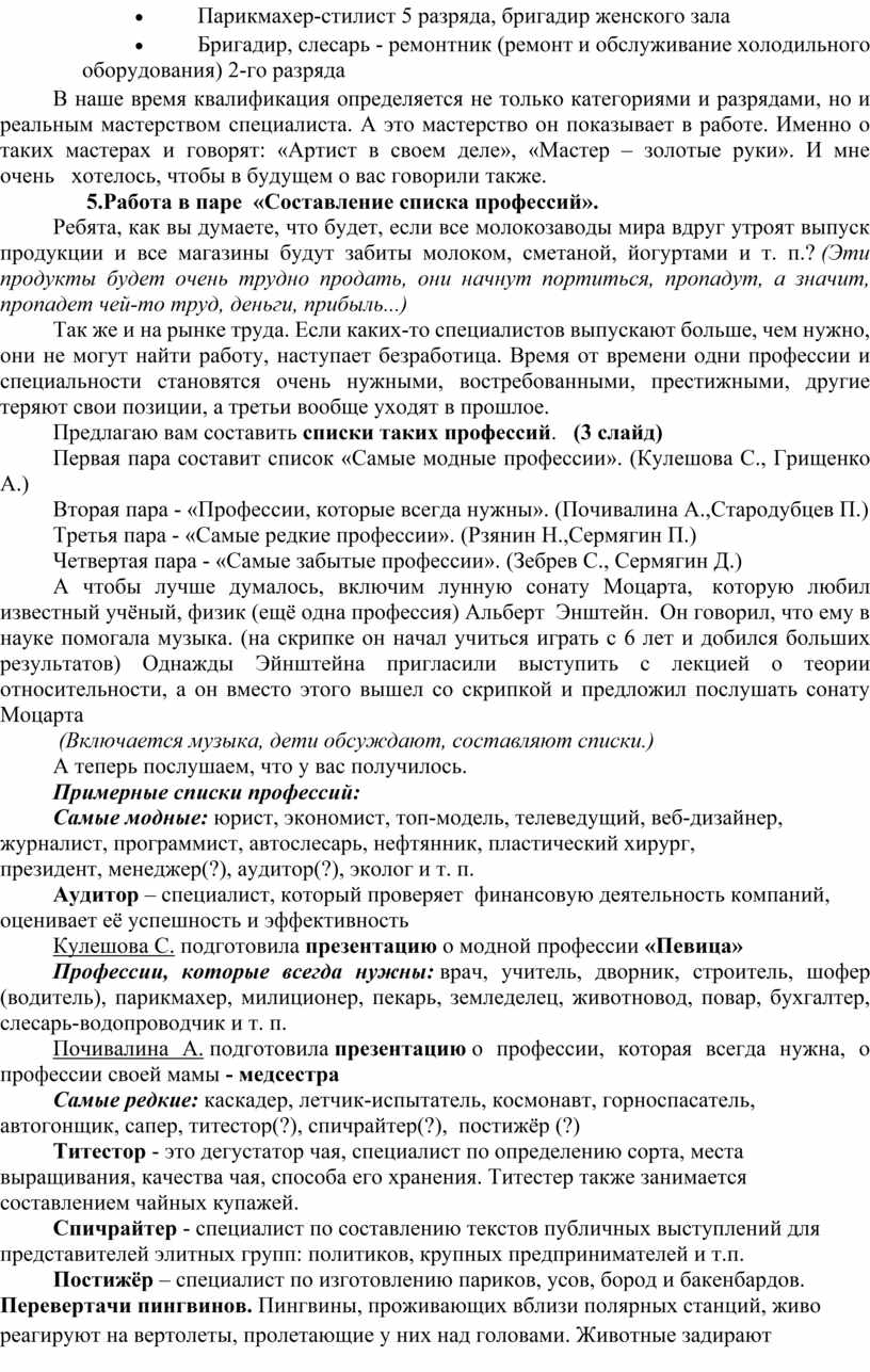 Подготовительная работа с детьми: предложить 4 уч-cя подготовить презентации о профессиях