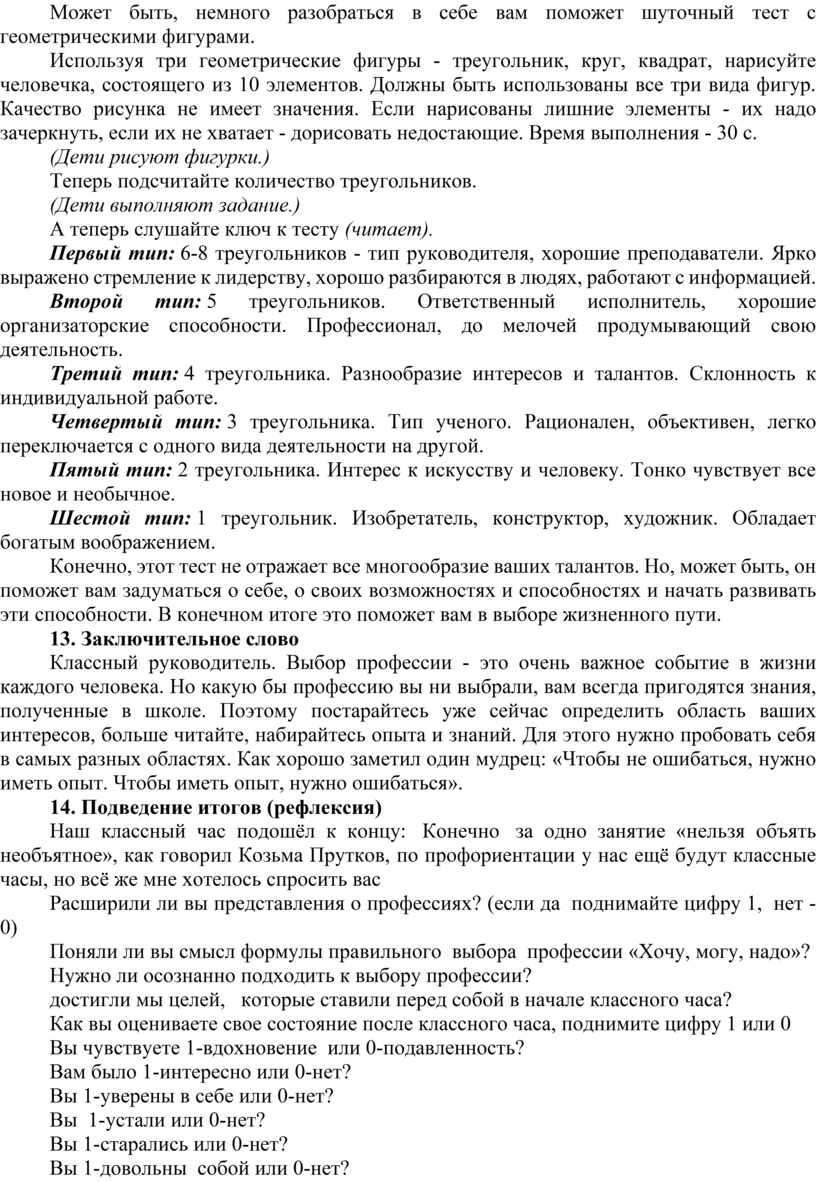 Наш классный час подошёл к концу: Конечно за одно занятие «нельзя объять необъятное», как говорил Козьма Прутков, по профориентации у нас ещё будут классные часы, но всё же мне хотелось спросить вас