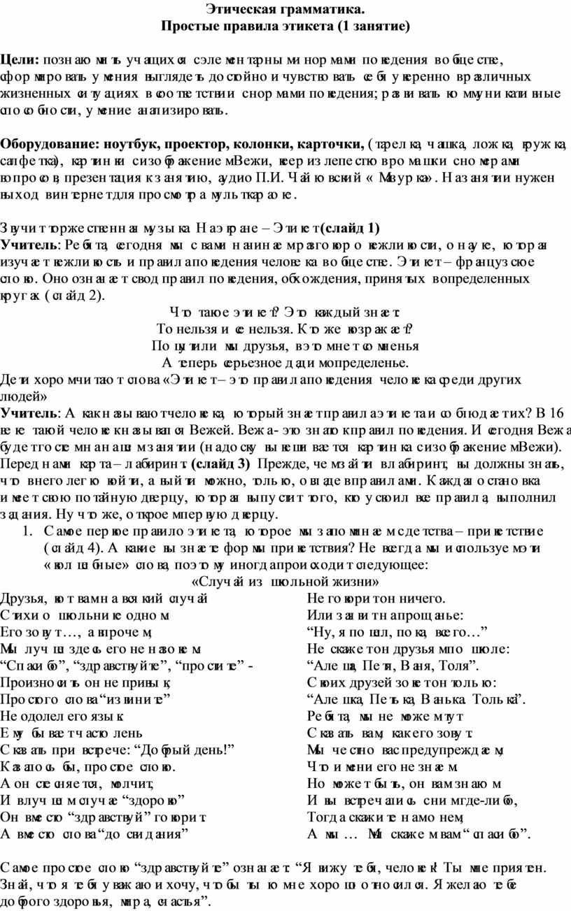Цели: познакомить учащихся с элементарными нормами поведения в обществе, сформировать умения выглядеть достойно и чувствовать себя уверенно в различных жизненных ситуациях в соответствии с нормами поведения; развивать коммуникативные способности, умение анализировать.