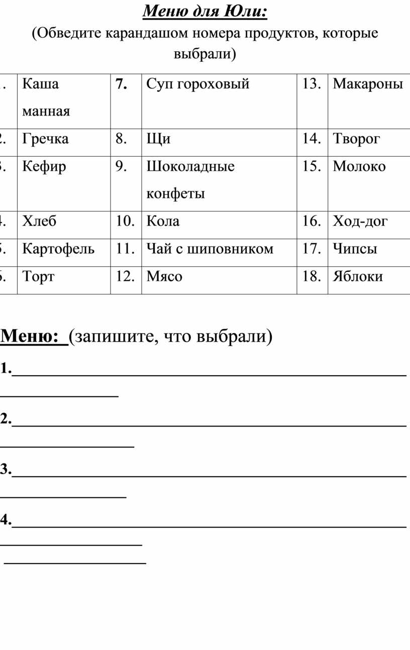 Меню: (запишите, что выбрали)