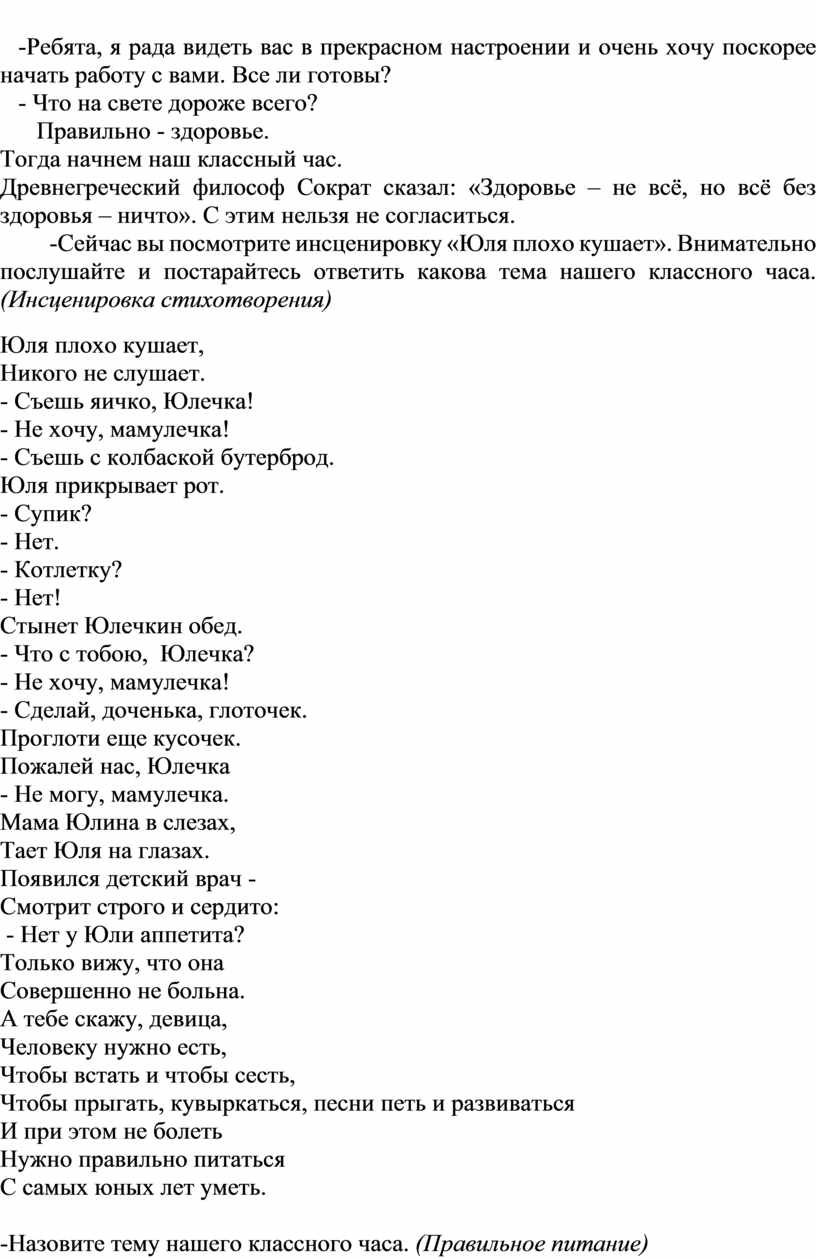 -Сейчас вы посмотрите инсценировку «Юля плохо кушает». Внимательно послушайте и постарайтесь ответить какова тема нашего классного часа. (Инсценировка стихотворения)