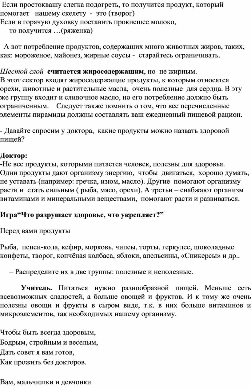 Цель: создать условия для формирования правильного отношения к своему здоровью через понятие здорового питания.