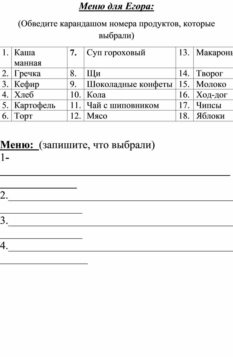 Меню для Егора: