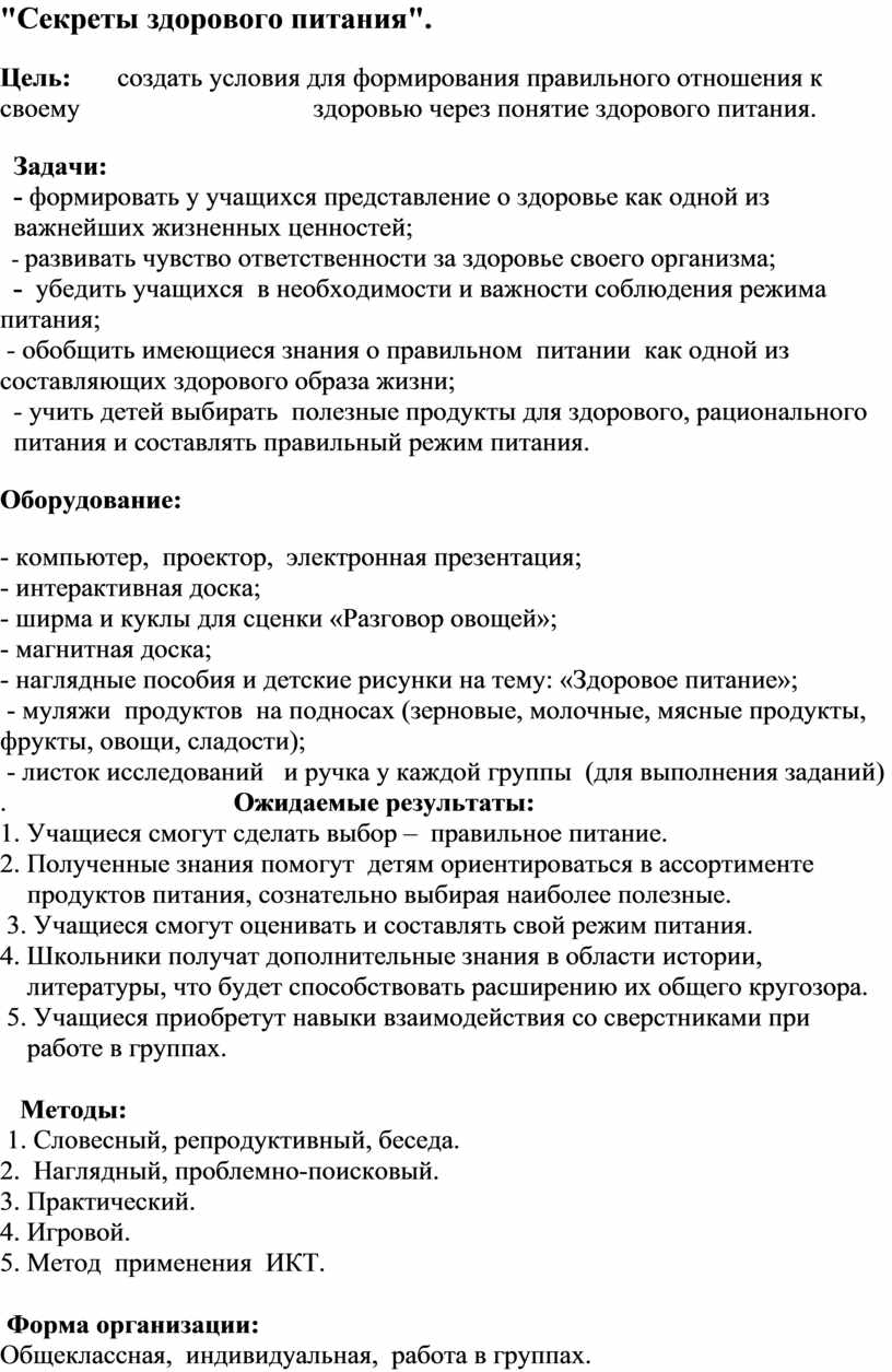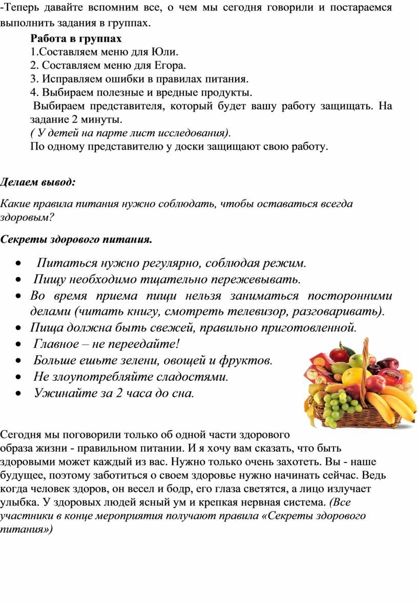- обобщить имеющиеся знания о правильном питании как одной из составляющих здорового образа жизни;