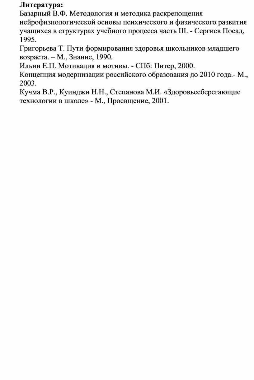 Григорьева Т. Пути формирования здоровья школьников младшего возраста. – М., Знание, 1990.