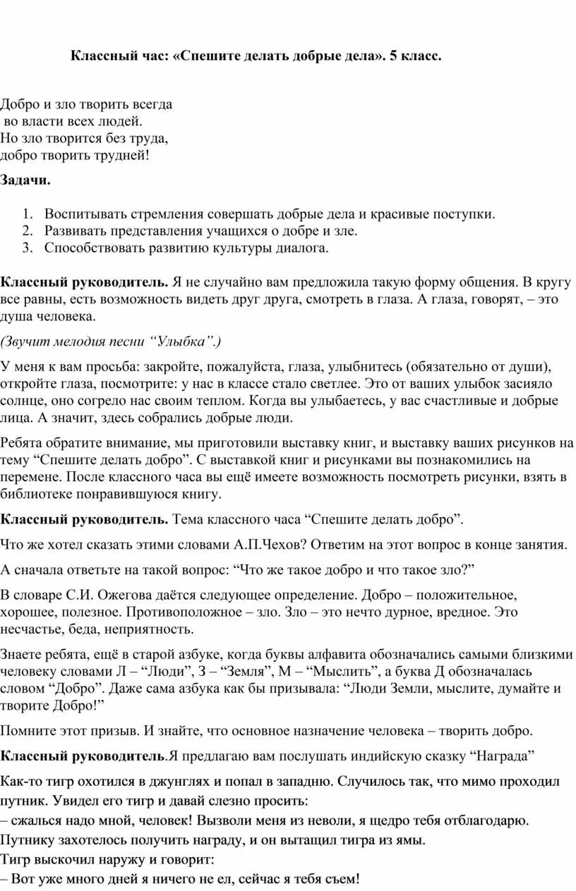 Классный час: «Спешите делать добрые дела». 5 класс.