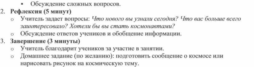 o Домашнее задание (по желанию): подготовить сообщение о космосе или нарисовать рисунок на космическую тему.