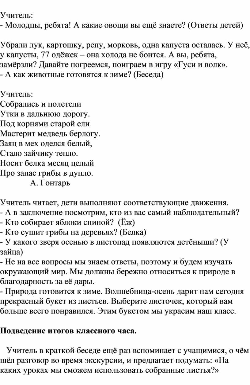 Учитель в краткой беседе ещё раз вспоминает с учащимися, о чём шёл разговор во время экскурсии, и предлагает подумать: «На каких уроках мы сможем использовать собранные листья?»