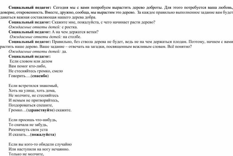 Социальный педагог: Правильно, без ствола дерева не будет, ведь не на чем держаться плодам. Поэтому, начнем с вами растить наше дерево. Ваше задание – отвечать на загадки, посвященным вежливым словам. Всё понятно?
