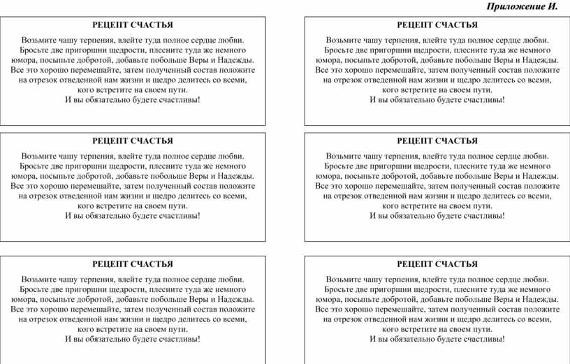 добротой, добавьте побольше Веры и Надежды. Все это хорошо перемешайте, затем полученный состав положите на отрезок отведенной нам жизни и щедро делитесь со всеми, кого встретите на своем пути. И вы обязательно будете счастливы! РЕЦЕПТ СЧАСТЬЯ Возьмите чашу терпения, влейте туда полное сердце любви. Бросьте две пригоршни щедрости, плесните туда же немного юмора, посыпьте