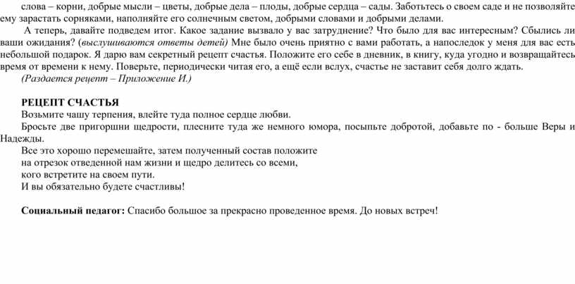А теперь, давайте подведем итог. Какое задание вызвало у вас затруднение? Что было для вас интересным? Сбылись ли ваши ожидания? (выслушиваются ответы детей) Мне было очень приятно с вами работать, а напоследок у меня для вас есть небольшой подарок. Я дарю вам секретный рецепт счастья. Положите его себе в дневник, в книгу, куда угодно и возвращайтесь время от времени к нему. Поверьте, периодически читая его, а ещё если вслух, счастье не заставит себя долго ждать.