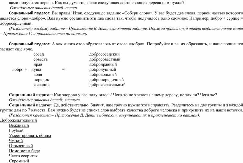 Социальный педагог: Сегодня мы с вами попробуем вырастить дерево доброты. Для этого потребуется ваша любовь, доверие, откровенность. Вместе, дружно, сообща, мы вырастим это дерево. За каждое правильно выполненное задание вам будет даваться важная составляющая нашего дерева добра.