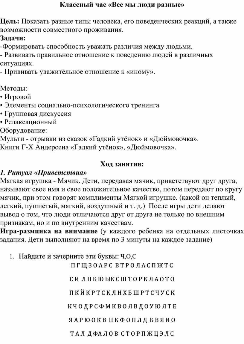 Мягкая игрушка - Мячик. Дети, передавая мячик, приветствуют друг друга, называют свое имя и свое положительное качество, потом передают по кругу мячик, при этом говорят комплименты Мягкой игрушке. (какой он теплый, легкий, пушистый, мягкий, воздушный и т. д.) После игры дети делают вывод о том, что люди отличаются друг от друга не только по внешним признакам, но и по внутренним качествам.