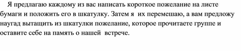 Я предлагаю каждому из вас написать короткое пожелание на листе бумаги и положить его в шкатулку. Затем я их перемешаю, а вам предложу наугад вытащить из шкатулки пожелание, которое прочитаете группе и оставите себе на память о нашей встрече.