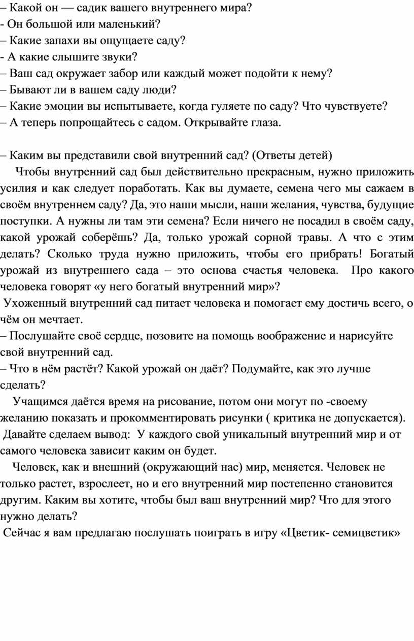 Чтобы внутренний сад был действительно прекрасным, нужно приложить усилия и как следует поработать. Как вы думаете, семена чего мы сажаем в своём внутреннем саду? Да, это наши мысли, наши желания, чувства, будущие поступки. А нужны ли там эти семена? Если ничего не посадил в своём саду, какой урожай соберёшь? Да, только урожай сорной травы. А что с этим делать? Сколько труда нужно приложить, чтобы его прибрать! Богатый урожай из внутреннего сада – это основа счастья человека. Про какого человека говорят «у него богатый внутренний мир»?
