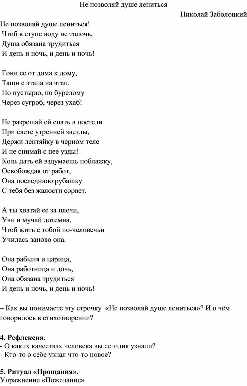 – Как вы понимаете эту строчку «Не позволяй душе лениться»? И о чём говорилось в стихотворении?