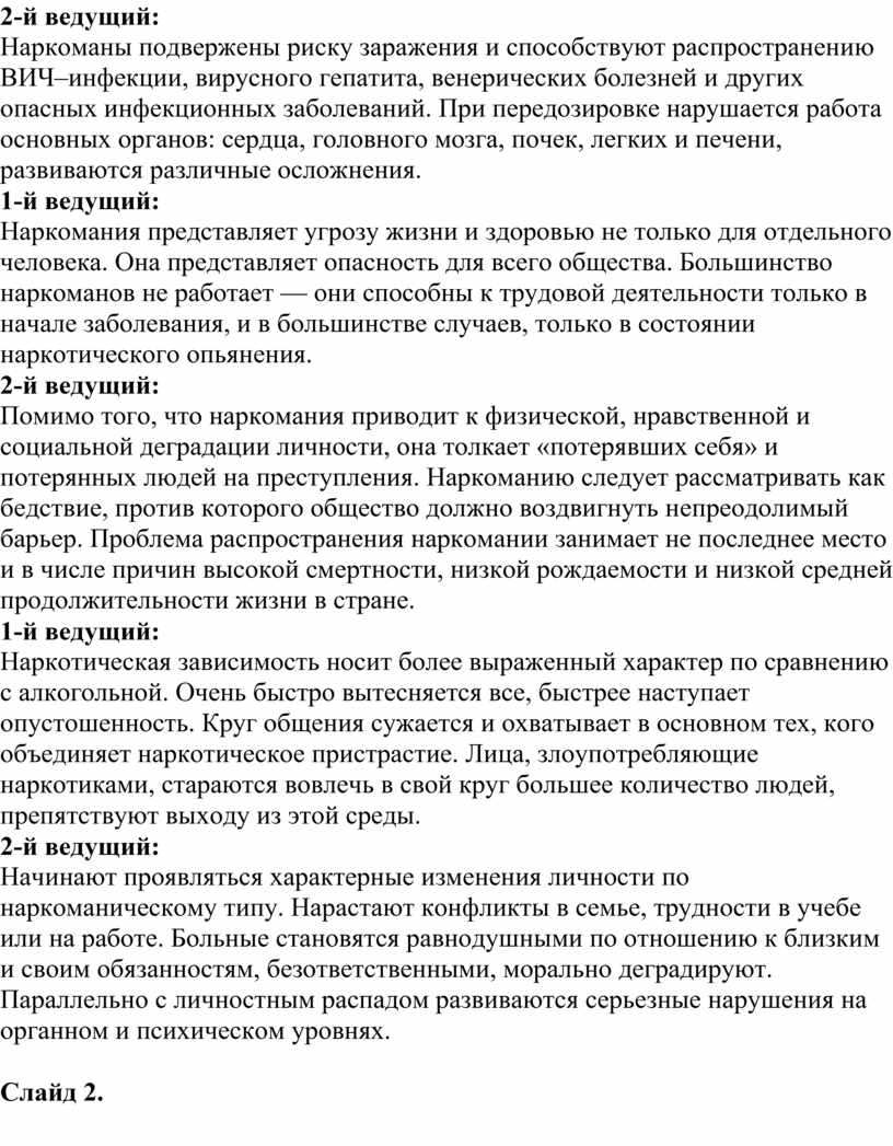 Наркомания вошла с нами в 21 век и уже не так редки слова: «Умер от передозировки», «Заразился СПИДом от шприца с наркотиком», «Покончил жизнь оттого, что не достал очередную дозу». Сегодня наркомания железной хваткой взялась за Россию. Если с ней не бороться, что же ожидает наше общество, а особенно молодежь, в будущем?