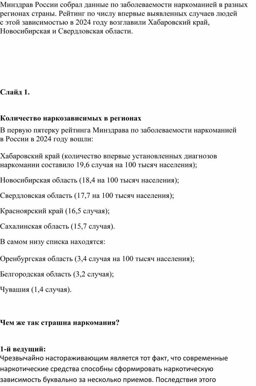 1. Хабаровский край (количество впервые установленных диагнозов наркомании составило 19,6 случая на 100 тысяч населения);