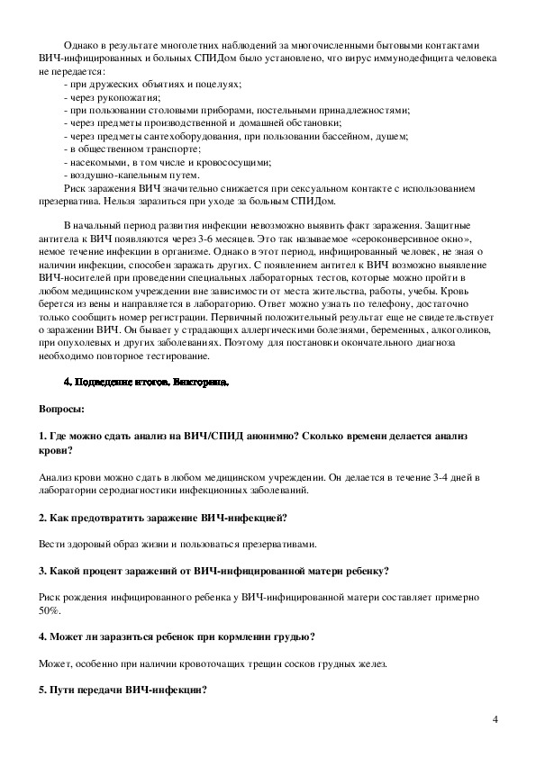 4. Подведение итогов. Викторина5. Раздача буклетов «ВИЧ и СПИД »