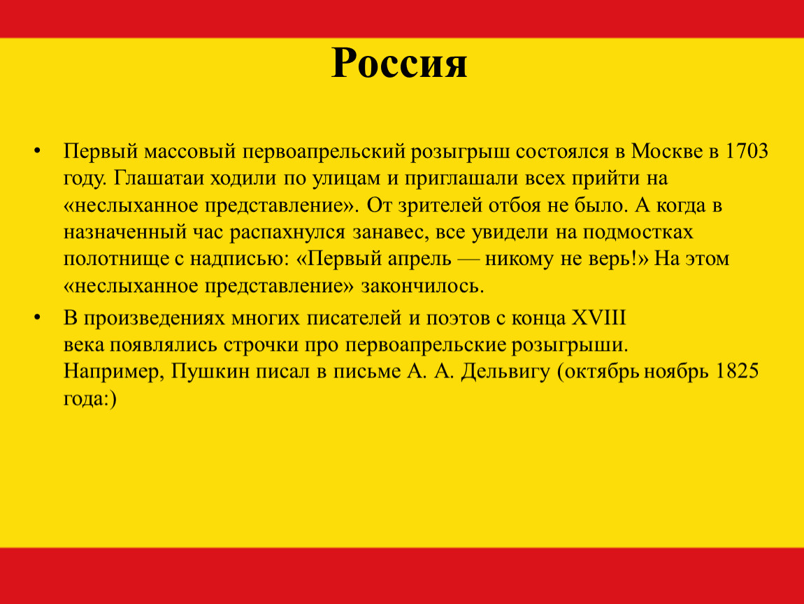 Первый массовый первоапрельский розыгрыш состоялся в Москве в 1703 году. Глашатаи ходили по улицам и приглашали всех прийти на «неслыханное представление». От зрителей отбоя не было. А когда в назначенный час распахнулся занавес, все увидели на подмостках полотнище с надписью: «Первый апрель — никому не верь!» На этом «неслыханное представление» закончилось.