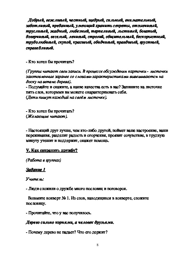 Научить детей дружбе — одна из задач, которую постоянно решают и учителя, и психологи, и родители. Эта задача была актуальной всегда. Каждый учитель, принимая под свое руководство новый класс, мечтает о том, что пройдет время, и из него получится настоящий дружный коллектив, в котором будет легко и приятно не только преподавать, учить и воспитывать, но и жить в полном смысле этого слова.Классный час «Дерево сильно корнями, а человек друзьями»