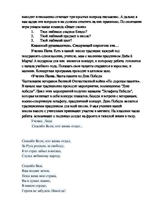План-конспект классного часа. Можно проводить в старших классах. Для проведения нужен большой плакат дома из кирпичей, презентация, заранее ребятам раздать материал для чтения. Нужна шкатулка для вопросов. Весь классный час ориентирован на школьные традиции: Новый год, выпускной, 8 марта, .....